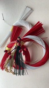 紅白水引のしめ飾りは染め分け水引を使用しています。古来から使われてきた無垢な素材を残して半分を赤く染めた祝い事に使われる水引です。